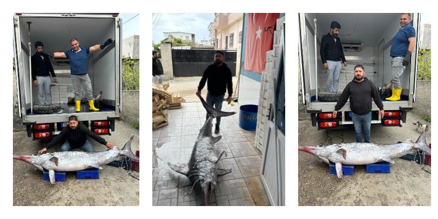 Adana’nın Karataş ilçesinde balıkçıların ağına 150 kiloluk kılıç balığı takıldı.
