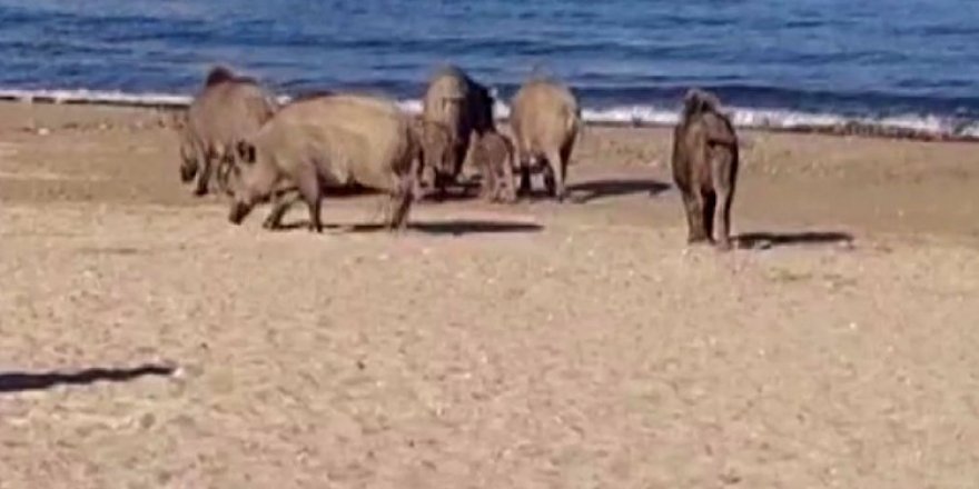 Aydın'ın turistik ilçesi Kuşadası'nda irili ufaklı domuz sürüleri halk plajını bastı.