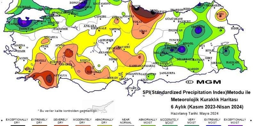 Ağustos 2023 ile Nisan 2024 tarihleri arasındaki 9 aylık meteorolojik kuraklık değerlendirmesinde Akdeniz ve İç Anadolu Bölgesi’nin güney ve batı kesimlerinde, Güney ve İç Ege ile Orta Karadeniz’de değişen şiddette meteorolojik kuraklık yaşanırken; Mayıs 2023 ile Nisan 2024 tarihleri arasındaki 12 aylık dönemde de Antalya’nın Finike, Kaş, Elmalı ve Korkuteli ilçeleri ile Karaman, Kahramanmaraş ve çevrelerinde orta şiddetli; Kırıkkale, Yozgat, Sivas ve Ordu çevrelerinde ise hafif şiddette meteorolojik kuraklık izlendi.