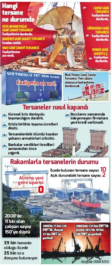 Tuzla 'dan sonra Türkiye 'nin ikinci önemli tersane üssü Karadeniz Ereğli 'de bu günlerde yaprak kıpırdamıyor. 1970 'de tek bir tersane ile yola çıkılan ilçede 10 tersane faaliyete geçti. Ancak söz konusu tersanelerin tamamına yakını şimdilerde kapalı durumda. Kimi kapısına kilit vurdu, kimi icradan satıldı. 2008 'de 11 bin kadar kişinin çalıştığı bölgede şimdilerde 150 kadar kişi çalışıyor. Yine aynı dönemde ilçede 13 bin olan icra dosyası sayısı 35 bine çıktı. 20 bin kadar kişi ilçeden göç etti.