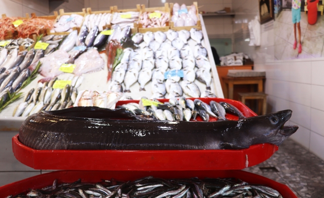 Kılıç, ıstakoz, çipura, levrek, hamsi, kolyoz ve torik gibi balık çeşitleri tezgahları süslerken, boğazda avlanarak satılması için balıkhaneye getirilen mıgri görenleri şaşırttı.