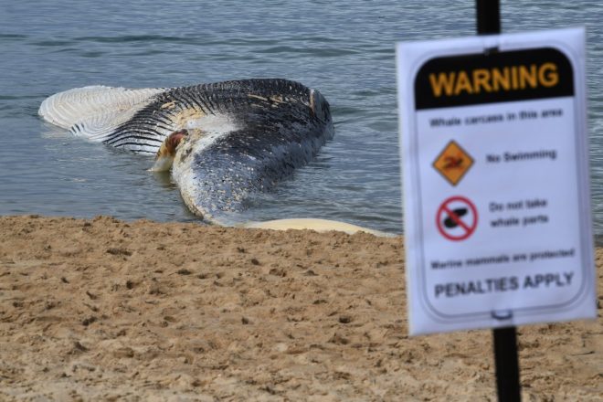 Uzmanlar ölü balinanın bölgedeki köpekbalığı varlığını artırdığına dikkat çekerken, plaj yüzme faaliyetlerine kapatılmasına karşın ziyaretçi akınına uğruyor.