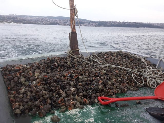 Elindeki fileye deniz salyangozlarını dolduran Akpınar, bir süre sonra sudan çıkarak salyangozları teknenin bir köşesine boşaltıyor.