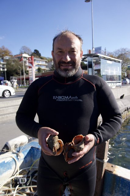 İstanbul Boğazı'nda 27 yıldır deniz salyangozu avlayan dalgıç Yücel Akpınar, deniz suyunun soğumasıyla sezonun son avlarını gerçekleştiriyor