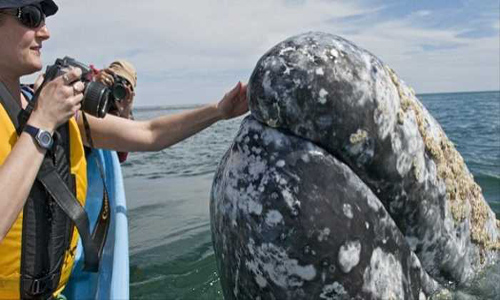 Turistlerle gözgöze gelen balinalar, kendilerine uzatılan elleri karşılıksız bırakmıyor.