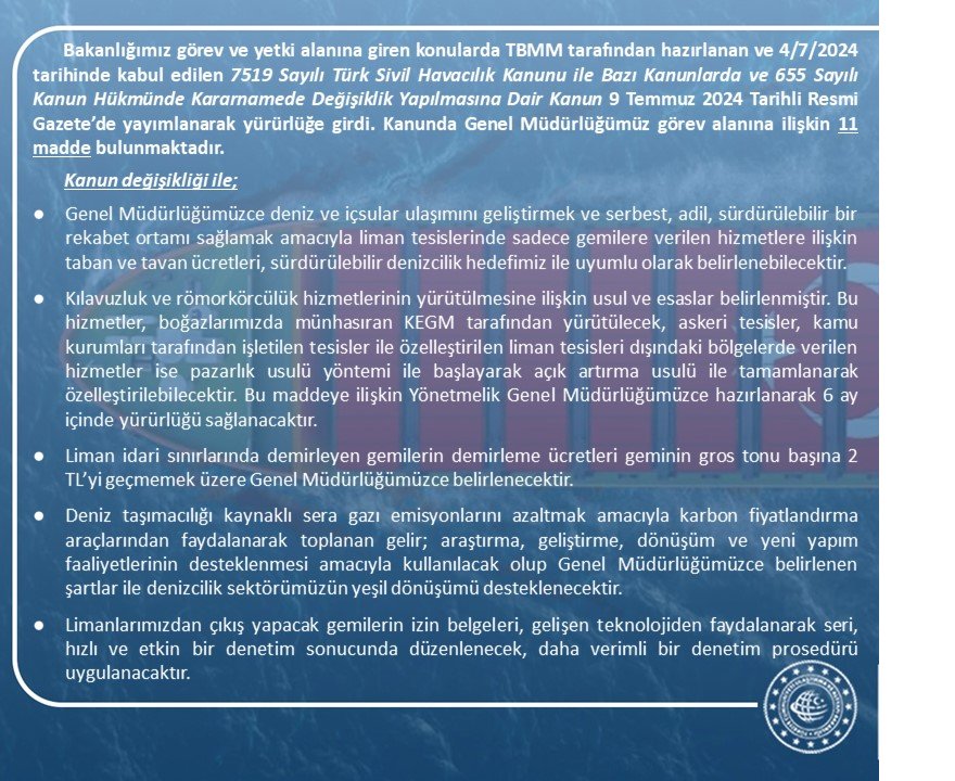 Denizcilik Genel Müdürlüğü, 7519 Sayılı Kanun ile ilgili detayları sosyal medya hesabından yaptı.