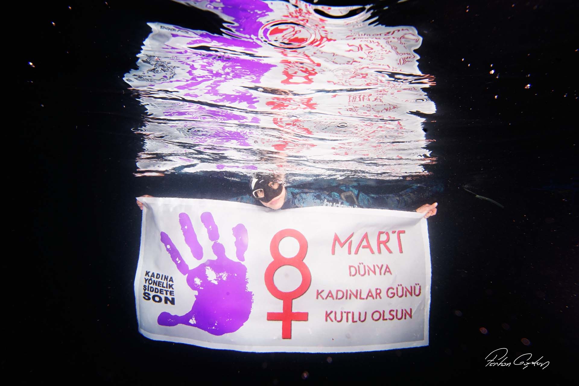 Çoğunluğu kadın 12 dalgıcın yanına nefesini tutarak gelen milli sualtı sporcusu Bilge Çingigiray ise pankartların yanında poz verdi. Bu etkinlikte kadın haklarının toplum tarafından daha iyi anlaşılması için çabaladıklarını söyleyen Derinlere Saygı Dalış Topluluğu, alevli meşalelerle su yüzeyine çıkarak izleyenlere görsel şov yaşattı.