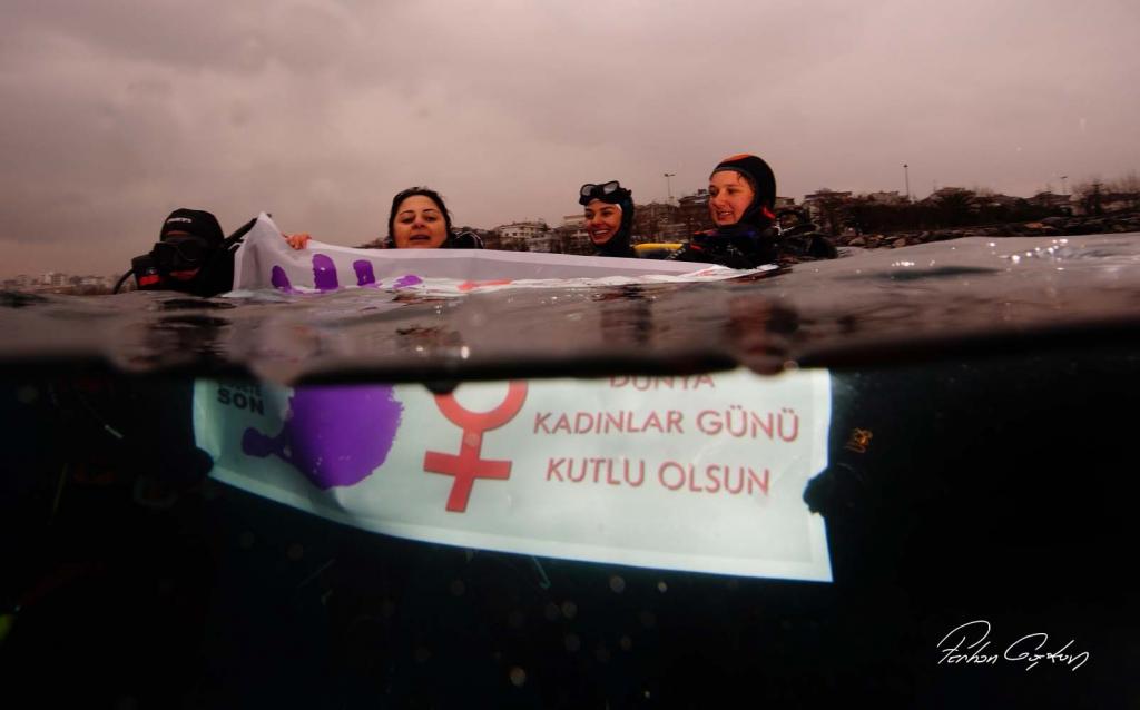 Dünya genelinde insan hakları temelinde kadınların maruz kaldığı haksızlık ve ayrımcılıkla mücadele etmek için her yıl 8 Mart tarihinde kutlanan Dünya Emekçi Kadınlar Günü için gönüllü dalgıçlar sessiz kalmadı. 8 Mart 1957 tarihinde ABD’de 40 bin kadın dokuma işçisinin hakları için mücadele ederken fabrikada çıkan yangında ölen 129 kadının anısına küresel olarak kutlanan gün nedeniyle Derinlere Saygı Dalış Topluluğu bir etkinlik düzenledi. Ulusal günlerimizde ve sualtında unutulan değerlerimizin hatırlatılmasında düzenledikleri ilginç gösterilerle tanınan gönüllü dalgıçlar bu kez kadınlar için daldı. Sabah saatlerinde Bostancı’dan 6 metre derinliğe dalan dalgıçlar suyun altında ‘İstanbul Sözleşmesi Yaşatır’ ve ‘8 Mart Dünya Emekçi Kadınlar Günü Kutlu Olsun’ pankartlarını açtı.