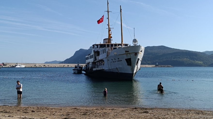 Bartın'ın Amasra ilçesinde halk plajına yüzmeye gelen yerli ve yabancı turistler, kumsalın yaklaşık 10 metre yakınlarında karaya oturan dev restoran-vapuru görünce şaşırdı.