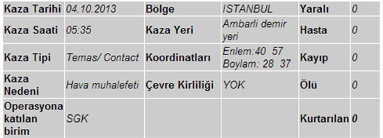 İstanbul Ambarlı demir yerinde demirli bulunan 120 metre boyunda içinde 14 mürettebat bulunan Türk bayraklı SULTAN isimli kuru yük gemisi demir tarayarak, aynı yerde demirli bulunan QB ELBA isimli geminin iskele tarafına çattı.