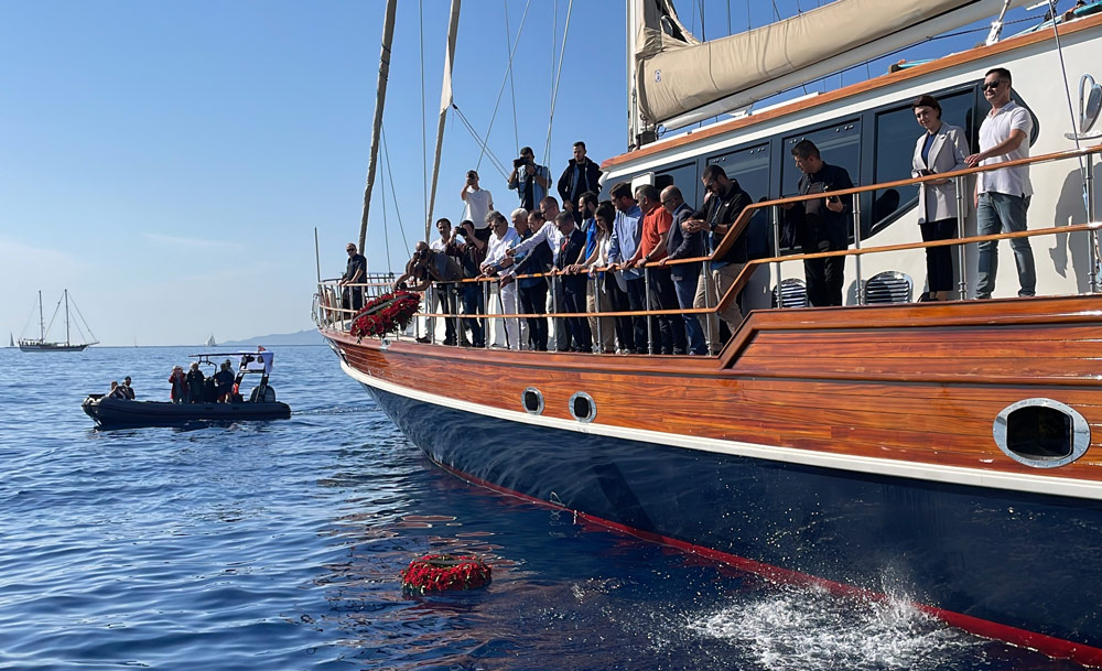Burada protokol üyelerince denize Bartın'da meydana gelen maden patlamasında hayatını kaybeden madencilerin anısına çelenk bırakıldı. Ardından da bir dakikalık saygı duruşunda bulunuldu.