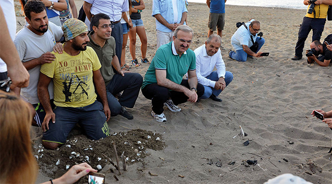 Sualtı Görüntüleme Yönetmeni ve Belgesel Yapımcısı Tahsin Ceylan ile birlikte ‘yaşayan fosiller' olarak adlandırılan deniz kaplumbağalarının yumurtadan çıkışlarına tanıklık eden ve arazi çalışmalarına katılan Vali Münir Karaloğlu, “Neslini sürdürme mücadelesi veren deniz kaplumbağalarının yaşam azmi insanoğluna ilham olmalı. Biz Antalya Valiliği olarak bu nadide canlıların yaşam kalitelerini yükseltmek, korunmalarına katkı sağlamak için üzerimize düşen görevi yapmaya hazırız” diye konuştu.