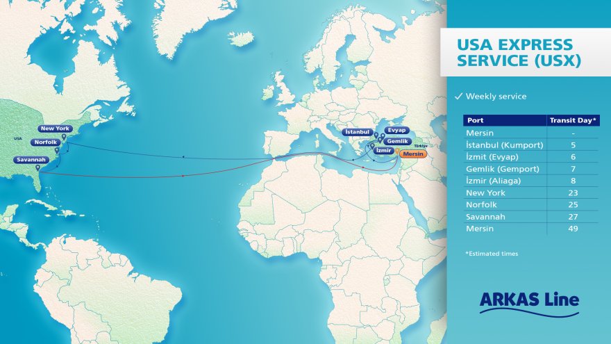 Bu gelişmeyle birlikte Arkas Line, ABD hattındaki taşıma kapasitesini iki katına çıkardı. USX servisi haftalık olarak 7 gemiyle şu rotada hizmet veriyor: Mersin – İstanbul (Kumport) – İzmit (Evyap) – Gemlik (Gemport) – İzmir (Aliağa) – New York – Norfolk – Savannah – Mersin.