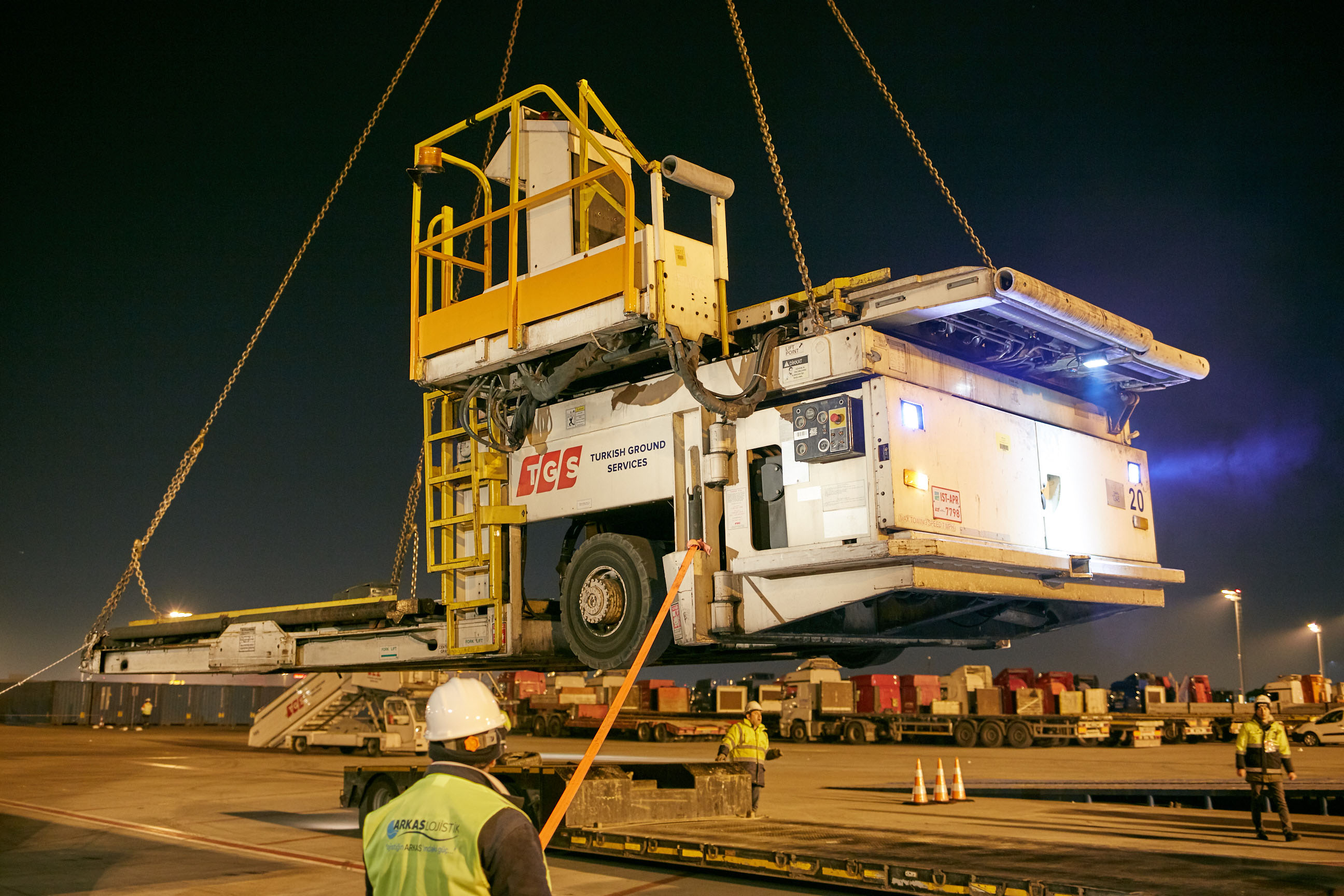 Arkas Lojistik, Türk Hava Yolları yer ekipmanlarını Atatürk Havalimanı’ndan 45 kilometre uzaklıktaki İstanbul Havalimanı’na taşıyor.
