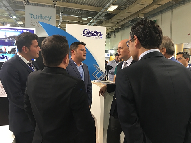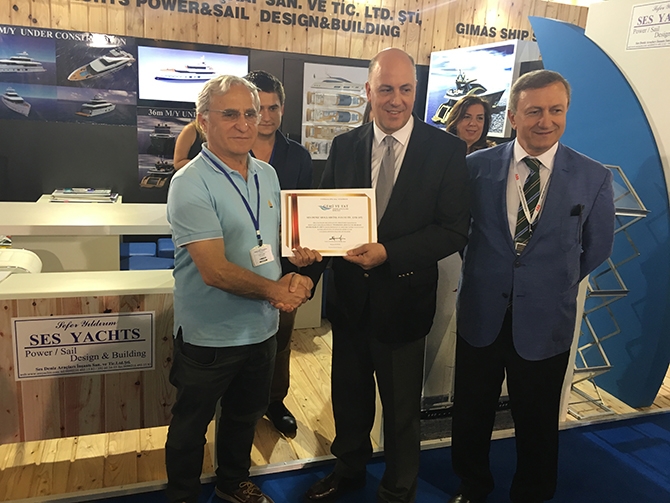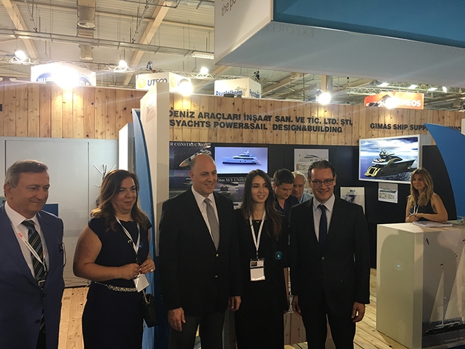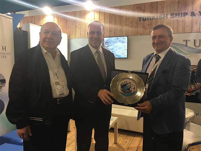 Büyükelçi Kerim Uras, Gemi ve Yat İhracatçıları Birliği tarafından hazırlanan fuar katılım belgelerini stand ziyaretleri sırasında Gemi ve Yat ihracatçıları Birliği Başkanı Başaran Bayrak ile katılımcılara taktim etti.
