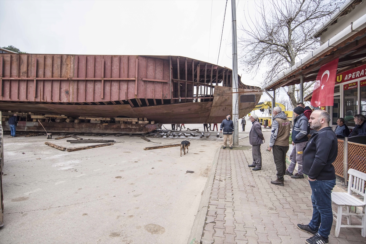 Yaklaşık 40 kişilik ekibin vinç, 3 kepçe ve 3 traktör yardımıyla gerçekleştirdiği çalışma 10 saat sürdü. Balıkçı limanına çekilen tekneye burada ilave parçalar monte edilecek.