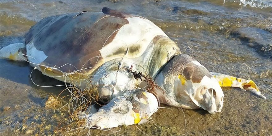 Carettayı sahile getiren Polat, yaptığı incelemede deniz canlısının boynuna ve yüzgeçlerine "hayalet ağ" olarak tabir edilen balık misinası dolanması sonucu öldüğünü belirledi.