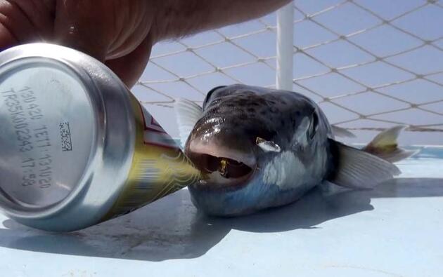 Balıkçıların oltasına çok sayıda küçük boy balon balığının yanı sıra, 40 santimetreye yakın balon balığı da takıldı. Amatör balıkçıların yakaladığı yaklaşık 2 kilo ağırlığındaki balon balığının dişleriyle tenekeyi parçaladığı anlar kaydedildi. Çenesiyle kestiği teneke parçasını ağzının içinde uzun süre tutabilen balon balığını yakalayan balıkçılar ölmesini bekliyor ya da denizde yaşamını sürdürememesi için kuyruğunu kesip, suya bırakıyor.