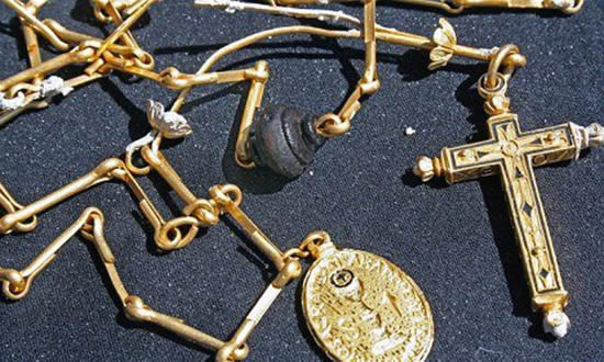 55 halkası bulunan altın zincirin ucunda haç şeklindeki bir madalyonla, iki yüzünde Meryem Ana ve kutsal kadehin bulunduğu bir madalyonun yer aldığı belirtildi. JB Magruder adlı gemiyle bölgeye giden Burt, madalyonun üzerinde Latince yazılar olduğunu, ancak ne anlama geldiğini bilmediğini ifade etti. İspanyol kalyonu 1622'de bin 38 gümüş ve 125 altın külçe ile denizin dibini boylamıştı.