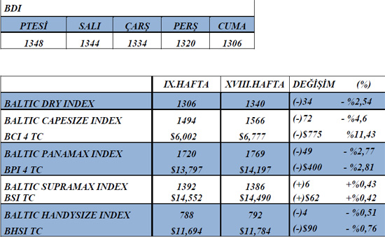Piyasa geçen hafta tekrar negatif yöne döndü, capesize ve panamax endekslerinin değer kaybetmesiyle BDI % 2,5 düşerek 1306’ya geriledi.