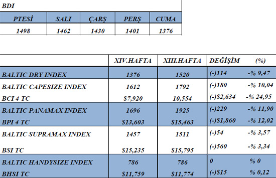 Özellikle büyük gemilerin kazançlarındaki kayıp nedeniyle piyasada diğer bir düşüş haftası daha yaşandı. Hafta boyunca % 10 civarında gerileyen BDI 1400 puanın altına düştü. Düşüşe sebep olan büyük tonajlı gemilerden capesize endeksi % 10, panamax endeksi ise % 12 civarında geriledi. Geçen hafta başında Çin’deki tatil nedeniyle, bu hafta için Çin alımlarının tekrar başlayacağı ümidiyle iyimser beklentiler mevcut. Diğer yandan kısa ve orta vadede bütün gözler Japonya’nın yeniden inşasının başlamasında.