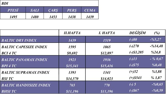 21 seanslık bir düşüşten sonra BDI geçen haftanın son günü 1 puan arttı ve haftayı 1439 puandan kapattı. Genel endeksdeki haftalık kayıp % 5’in üzerinde oldu. Capesize endeksi % 14,5’luk değer kaybı ile yine haftanın en fazla kaybedeni oldu. Panamax ve handysize endeksleri bulunduğu seviyeyi korurken supramax endeksi % 4’e yakın arttı.