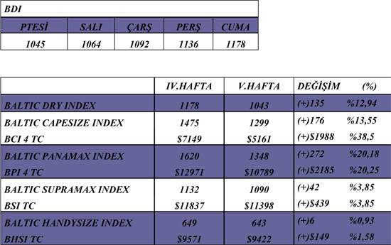 Iki aydır genel bir düşüş terndinde olan ve bu süre zarfinda % 50’nin üzerinde değere kaybeden Baltık Dry Endeksi geçen hafta boyunca yeni yük talepleri nedeniyle % 13 civarında bir artış sağlamayı başardı. Çin’de tatilin sona ermesi ve Avustralyanın selin oluşturduğu olumsuzluklardan yavaş yavaş sıyrılması ile uzun bir aradan sonra bütün endeksler pozitife döndü. Panamaxlar başta olmak üzere büyük tonaj kazançlarında önemli artışlar kaydedildi, küçük tonajlarda ise artışlar ılımlı düzeyde kaldı.