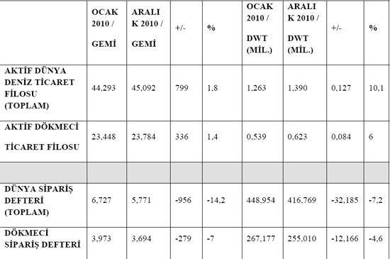 Dökmeci, tanker, konteyner, gaz taşıyıcı, RoRo, soğuk hava gemisi, otomobil taşıyıcı olarak tüm temel sektörlerdeki aktif ve hizmette olan dünya deniz ticaret filosu 2010 yılı sonu itibarıyla 45,092 gemiden oluşuyor. Bu miktar Ocak 2010’da biraz daha aşağıda ve 44,293’dü.