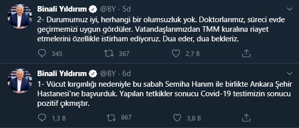 Türkiye Cumhuriyeti'nin 27. Dönem Başbakanı ve TBMM 28. Dönem Meclis Başkanı, AK Parti İzmir Milletvekili Binali Yıldırım, koronavirüs testinin pozitif çıktığını açıkladı.
