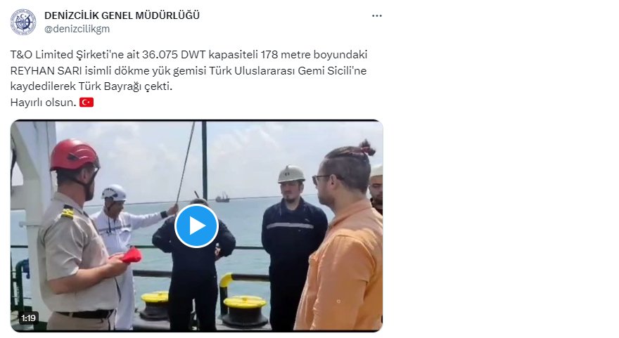“T&O Limited Şirketi'ne ait 36 bin 75 DWT kapasiteli 178 metre boyundaki Reyhan Sarı isimli dökme yük gemisi Türk Uluslararası Gemi Sicili'ne kaydedilerek Türk bayrağı çekti. Hayırlı olsun.”