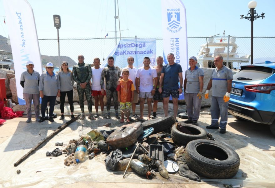 Bodrum Belediyesinin gönüllü dalgıçlarından oluşan ekip plastik, metal, cam, otomobil lastiği ve diğer atıklar olmak üzere iki saatte 106 kilogram atık topladı.