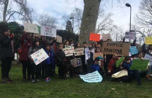 Saat 12:00'de Bebek Parkı'na gelen öğrenciler "Büyüyünce yaşanabilir bir dünya istiyorum", "Geleceğimle oynama, kömür yakma" yazılı dövizler taşıdı, birlikte yürüyüş yapıp, ağaçların altında oturdu.