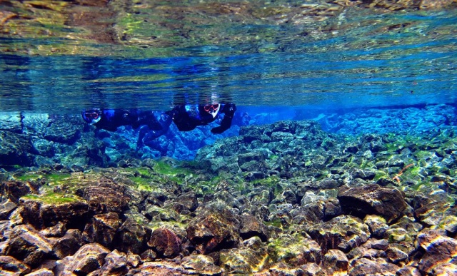 İzlanda Silfra’da yeryüzünü oluşturan dev kıtaların iki levhası hemen yan yana.