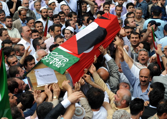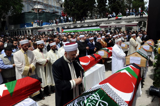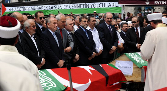 Türk ve Filistin bayrağına sarılı cenazeler, Fatih Camisi'nde kılınan cenaze namazının ardından konvoy eşliğinde Atatürk Havalimanı kargo binasına getirildi.