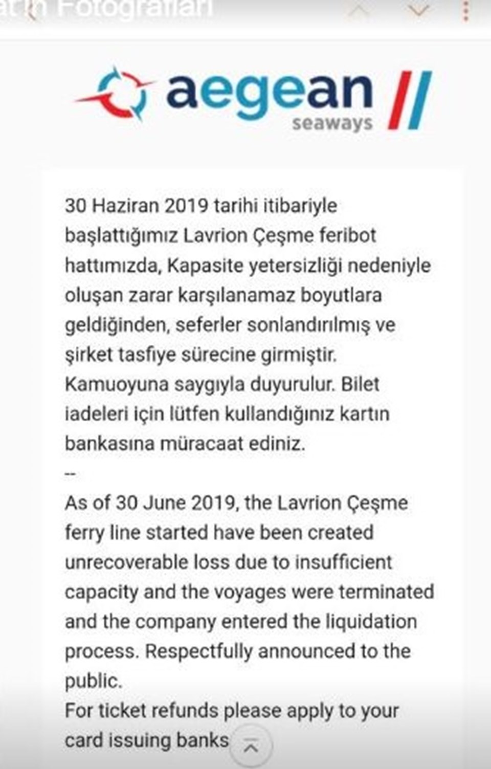 "30 Haziran 2019 tarihi itibariyle başlattığımız Lavrion- Çeşme feribot hattımızda, kapasite yetersizliği nedeniyle oluşan zarar karşılanamaz boyutlara geldiğinden, seferler sonlandırılmış ve şirket tasfiye sürecine girmiştir. Kamuoyuna saygıyla duyrulur. Bilet iadeleri için lütfen kullandığınız kartın bankasına müracaat ediniz."