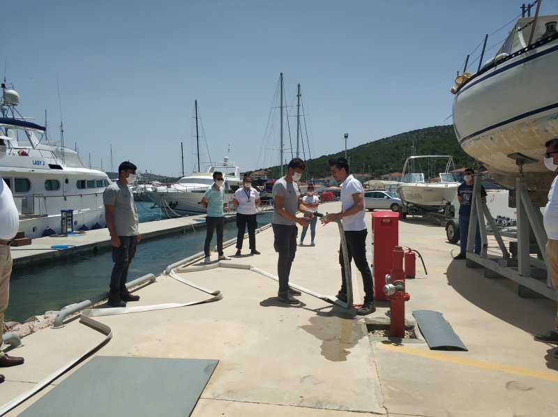 Çeşme Marina Acil Durum Müdahale Ekibi, olası bir yangın ile mücadele edebilmek için aldıkları eğitim ile kabiliyetlerini arttırdı.