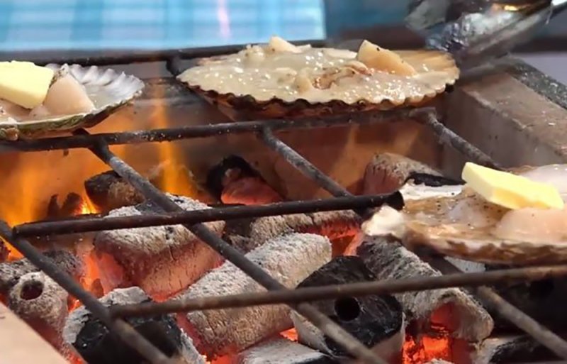 Deniz tarağındaki etler temizlenip doğrandıktan sonra ızgarada pişiriliyor.