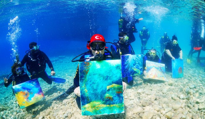 Muğla’nın Fethiye ilçesinde ilk kez düzenlenen Uluslararası Denizlerimiz ve Renklerimiz Sualtı Resim Çalıştayı su altında yapılan resimlerin sergisi törenle açıldı.