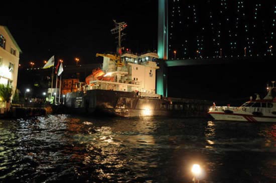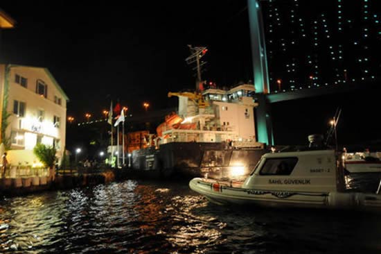 Kıyı Emniyeti Genel Müdürlüğünden yapılan açıklamaya göre, kuzey-güney geçişi yapan Ukrayna bayraklı 5 bin 500 ton soya fasulyesi yüklü ''Oles Honchar'' adlı kuru yük gemisi, Ortaköy önlerinde Esma Sultan Yalısı'na yaslanarak karaya oturdu.