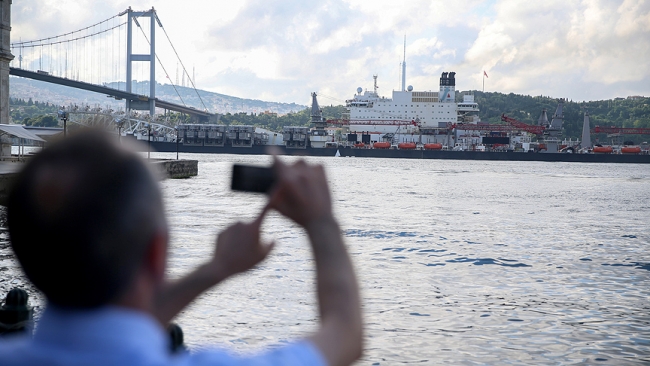 TürkAkım Doğalgaz Boru Hattı'nın derin sulardaki kısmını döşeme görevini üstlenen dünyanın en büyük inşaat gemisi Pioneering Spirit, İstanbul Boğazı'ndan geçiyor.