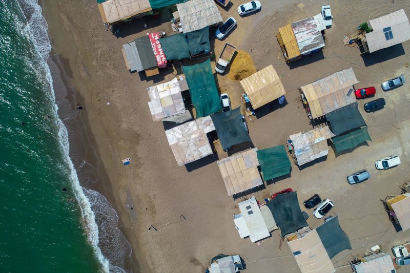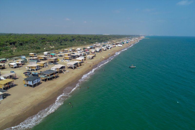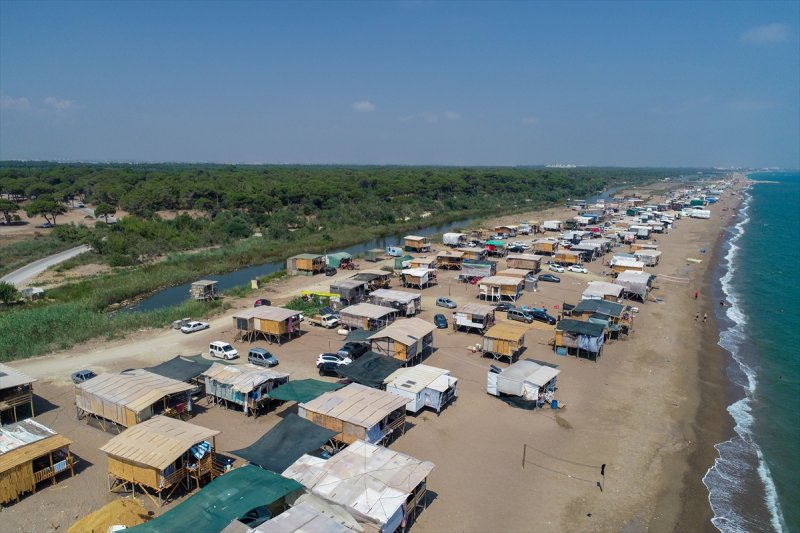Antalya’nın Aksu ilçesinde beş yıldızlı otellerin hemen yanına kurdukları çardaklarda kalan vatandaşlar, doğal yaşamla iç içe tatil yapmanın tadını çıkarıyor.