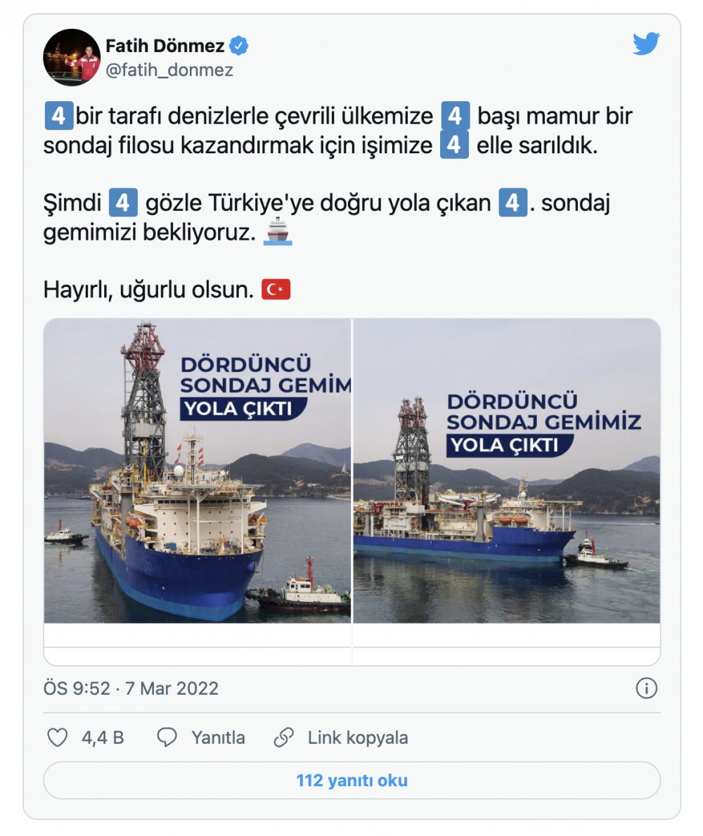 "Dört bir tarafı denizlerle çevrili ülkemize dört başı mamur bir sondaj filosu kazandırmak için işimize dört elle sarıldık. Şimdi dört gözle Türkiye'ye doğru yola çıkan dördüncü sondaj gemimizi bekliyoruz. Hayırlı, uğurlu olsun."