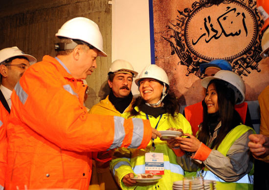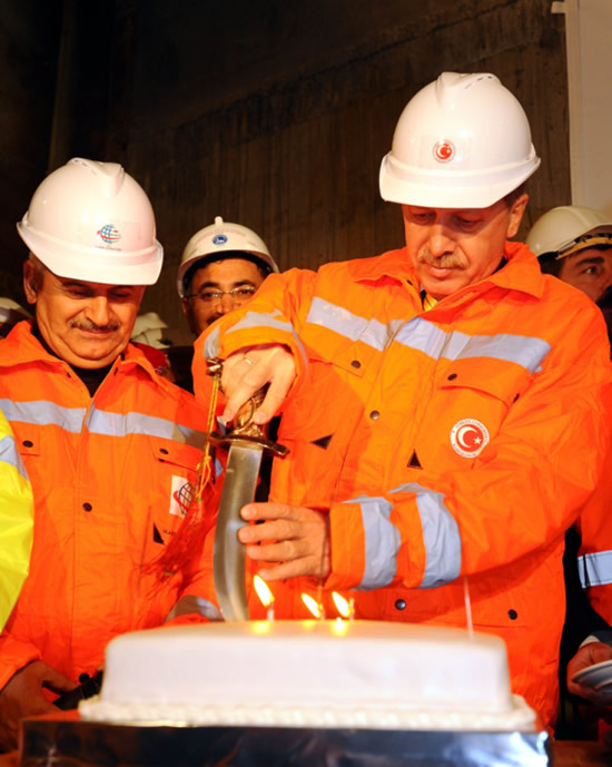Ulaştırma Bakanı Binali Yıldırım, Marmaray çalışanlarının denizin dibinde böyle bir sürpriz yapmak istediklerini belirterek, onlara teşekkür ettiğini ifade etti. Yıldırım, Başbakan Erdoğan'a başından beri verdiği destekten dolayı teşekkür ederek, ''Daha nice sağlık, sıhhat içinde beraber olmak arzusuyla'' dedi. Sürpriz karşısında şaşıran Erdoğan da ''Bu hassasiyeti, nezaketi, inceliği gösterenlere teşekkür ediyorum. Birlikte daha nice uzun yıllara, vatana, millete hizmete Allah ömür verdikçe devam edeceğim'' dedi. Başbakan Erdoğan daha sonra pastayı kesti ve Marmaray'ın kadın çalışanları ile kadın gazetecilere pasta ikram etti. Erdoğan daha sonra, 1387 metre uzunluğundaki tüp tüneli yürüyerek kat etti ve Üsküdar'da tünelden çıktı.