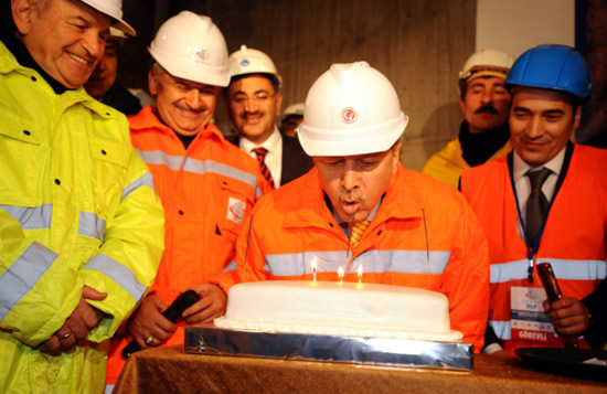 Başbakan Recep Tayyip Erdoğan'a, Marmaray çalışanları, delme tünelden tüp tünele geçiş noktasında sürpriz doğum günü organizasyonu yaptı.