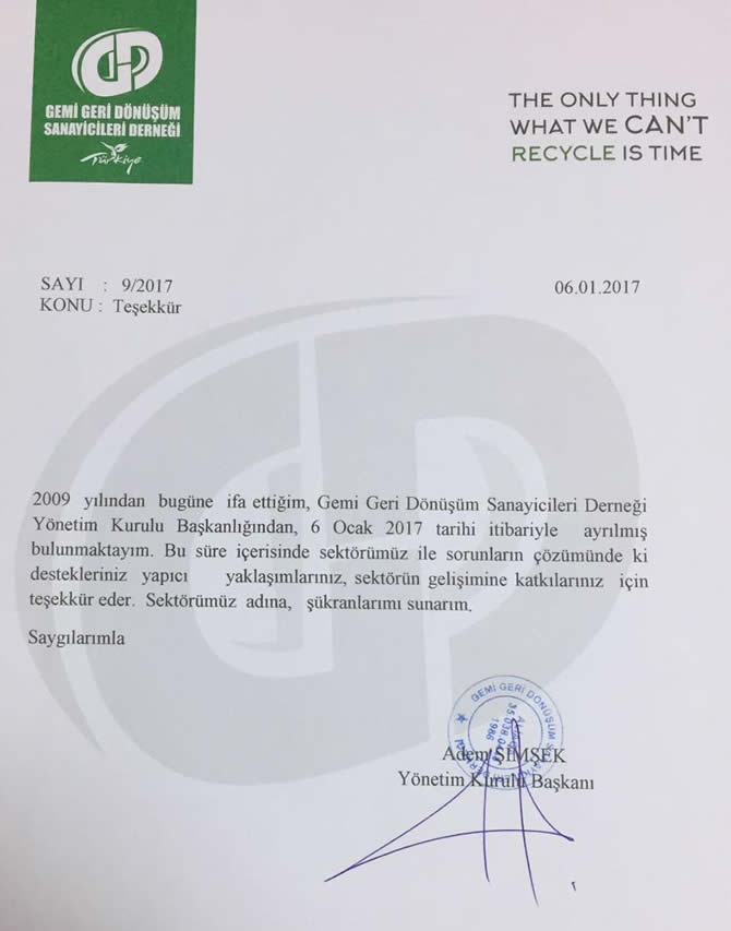 2009 yılından bugüne ifa ettiğim, Gemi Geri Dönüşüm Sanayicileri Derneği Yönetim Kurulu Başkanlığından, 6 Ocak 20017 tarihi itibariyle ayrılmış bulunmaktayım. Bu süre içerisinde sektörümüz ile sorunların çözümünde ki destekleriniz, yapıcı yaklaşımlarınız, sektörün gelişimine katkılarınız için teşekkür eder. Sektörümüz adına, şükranlarımı sunarım.