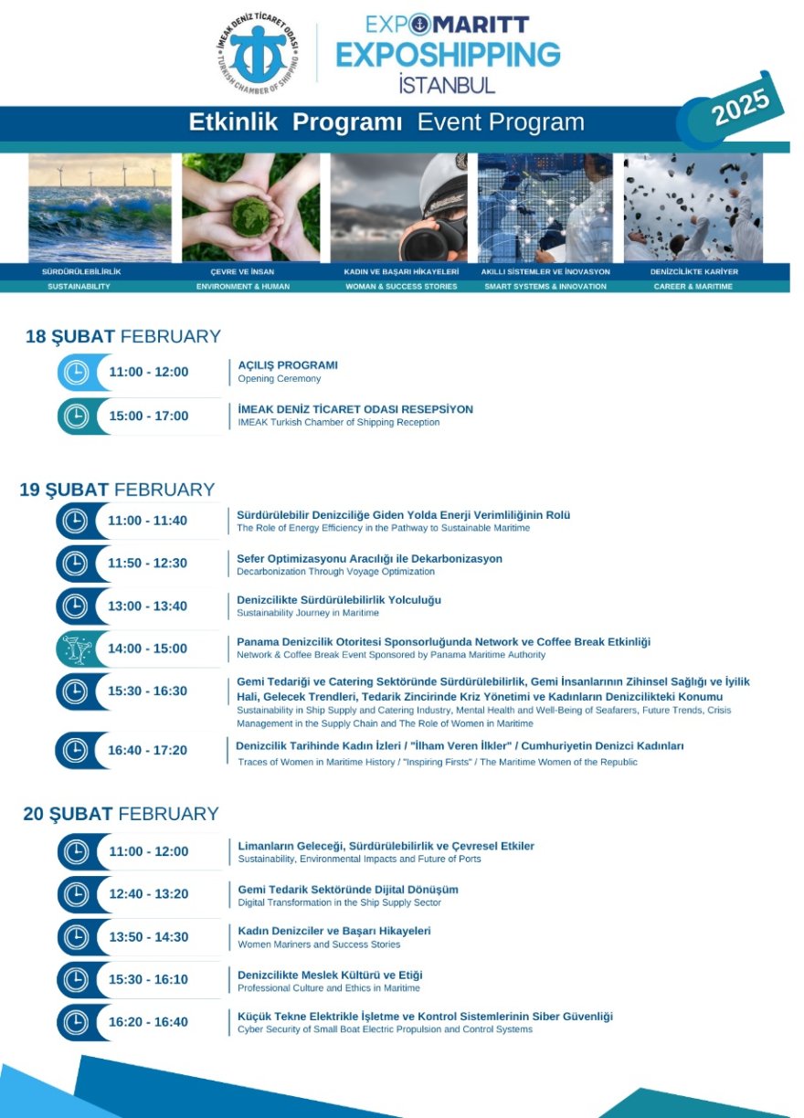 Expomaritt Konferanslarının 19 Şubat 2025 Çarşamba tarihli ilk oturumunda, fuarın Gold Sponsorları arasında da yer alan DNV Maritime firmasının Bölge Dekarbonizasyon Uzmanı Lefteris Koukoulopoulos, “Sürdürülebilir Denizciliğe Giden Yolda Enerji Verimliliğinin Rolü”nü anlatacak. Etkinliğin sonraki oturumunda, StormGeo Türkiye Satış Müdürü Yunus Kaya, “Sefer Optimizasyonu Aracılığı ile Dekarbonizasyon” ile ilgili bir sunum gerçekleştirecek. Moderatörlüğünü Sürdürülebilirlik Komisyon Başkanı Serdar Akdemir’in yapacağı “Denizcilikte Sürdürülebilirlik Yolcuğu” başlıklı seminerde ise Türk Armatörler Birliği Başkanı Cihan Ergenç, Uluslararası Armatörler Odası Başkan Yardımcısı Metin Düzgit ve DTO Danışmanı Mustafa İnsel konuşmacı olarak yer alacak. Panama Denizcilik Otoritesi Sponsorluğunda düzenlenecek Network ve Coffee Break Etkinliği’nin ardından “Çevre ve İnsan” ile “Denizcilik Tarihinde Kadın İzleri” konuşulacak.
