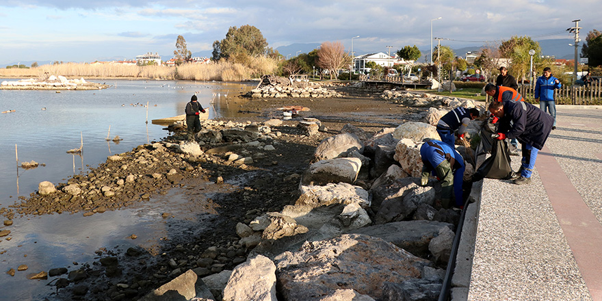 Çekilmenin ardından kıyıda beliren atıklar, Fethiye Belediyesi ekiplerince toplandı.