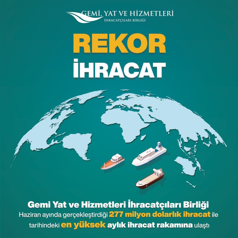 Gemi, Yat ve Hizmetleri sektörü; ihracat artış rekorları kırmaya devam ediyor. Türkiye’nin gemi ve yat sektörü, 2021 yılının mart ve mayıs aylarında olduğu gibi, haziran ayında da Türkiye’nin ihracatını en yüksek oranlı artıran sektörü oldu. Gemi, Yat ve Hizmetleri İhracatçıları Birliği (GYHİB), haziran ayında, bir önceki yılın aynı ayına kıyasla yüzde 214 oranında ihracat artışı ile toplamda yaklaşık 277.3 milyon dolar tutarında ihracat gerçekleştirdi. Sektör ihracatının Türkiye'nin toplam ihracatı içerisindeki payı yüzde 1,4 olarak gerçekleşti.