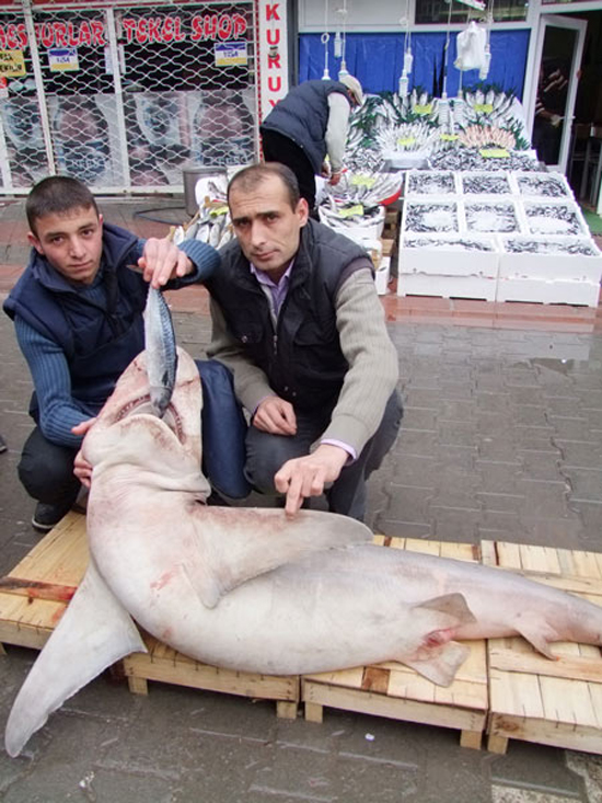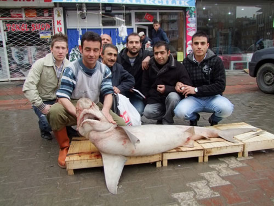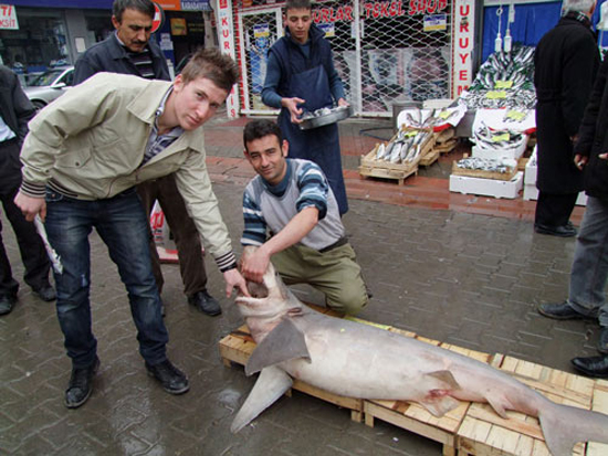 Liman Balıkçılık'ın Karadeniz'den getirdiği balığa vatandaşlar, 'Camgöz' ismini verdi. İlgi çekmek amacıyla 60 kilo ağırlığındaki köpek balığı, 3 gün boyunca sergilenecek. Balığın sahibi Vahit Demir, sipariş verenler olduğunu ancak satmayacağını söyledi. Köpekbalığı etinin kanser hastalarına iyi geldiğini ve bundan dolayı alıcısının çok olduğunu ifade eden Vahit Demir, Camgöz'ü sadece sergilemek için getirttiklerini söyledi. Demir, "Daha önceden de bizden köpekbalığı etini talep eden müşterilerimiz oluyordu. Köpek balığının sergilendiğini duyan vatandaşlar meraktan görmeye geliyorlar. 3 gün sergilendikten sonra geri göndereceğiz." dedi.