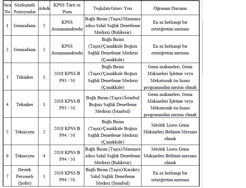 Yayımlanan resmi duyuruda tam zamanlı istihdam edilecek personellerden Gemi Adamı unvanı için başvuru yapacak kişilerin KPSS'ye girmiş olmasının zorunlu olmadığı belirtilirken, diğer unvanlar ve öğrenim durumlarıyla KPSS şartları şu şekilde oldu:
